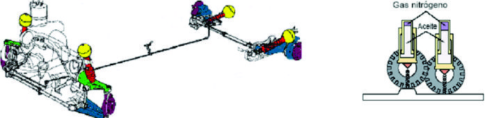 Las suspensiones hidroneumáticas se basan en esferas que en su interior contienen gas (nitrógeno) y aceite separados por una membrana elástica. Cuando una rueda encuentra un obstáculo aumenta la presión del líquido y a través de la membrana se comprime el gas que luego se vuelve a expandir haciendo las veces de muelle o amortiguador.